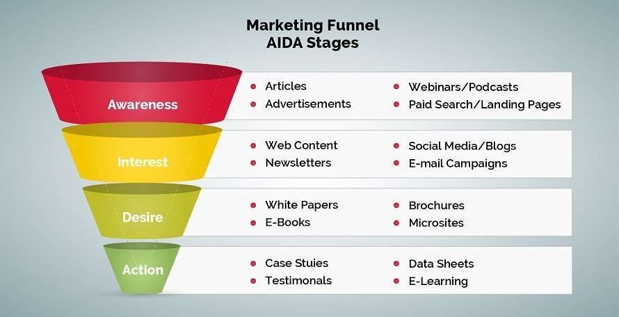 Per ogni fase di questo cosiddetto viaggio del cliente, gli esperti di marketing possono scegliere diversi strumenti e tattiche di marketing per aiutare i loro consumatori a percorrere l’imbuto e prendere la decisione di acquisto.
